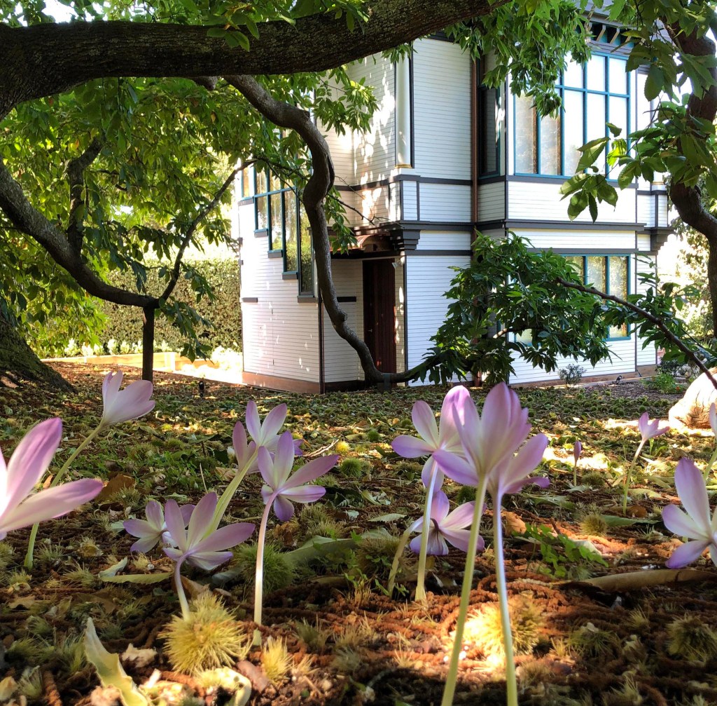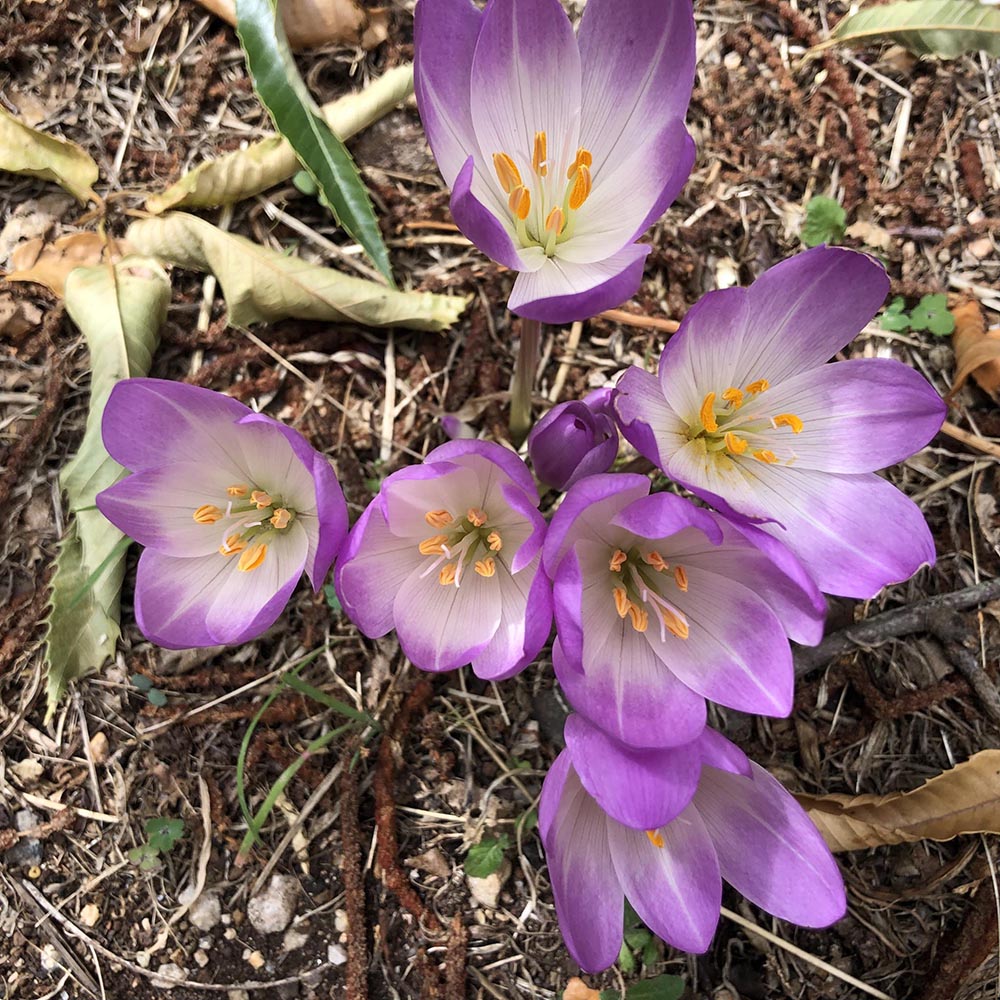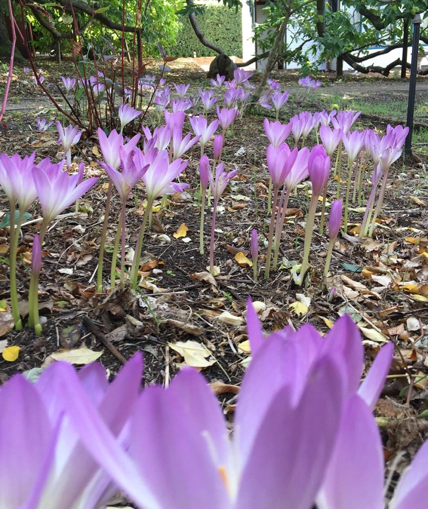 April 14 – May 6. The nerines are in flower, and last quite a while, as do the salvias. The trees are beginning to shed their leaves, beginning with the tulip tree.
