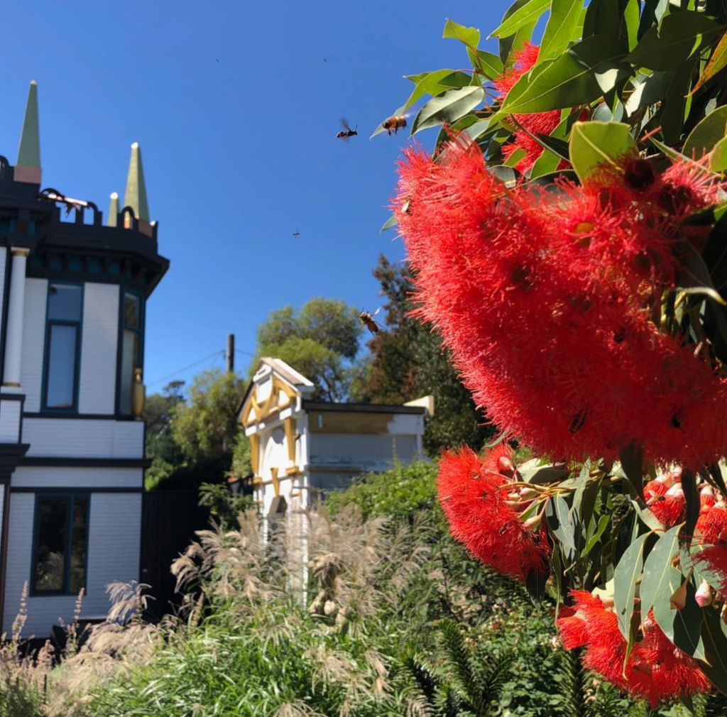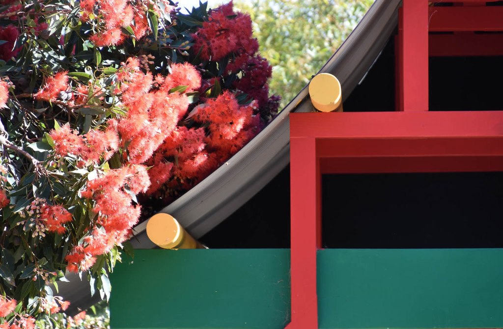 In late January into early February the red flowering gum complements the Chinoiserie Fabrique.