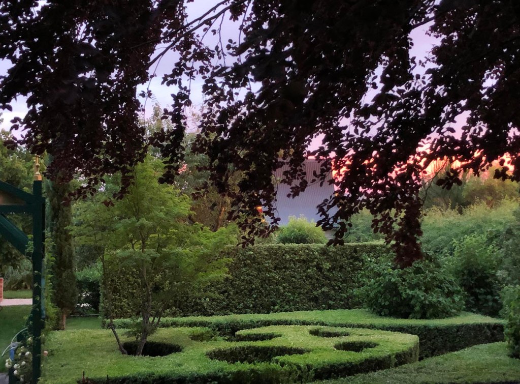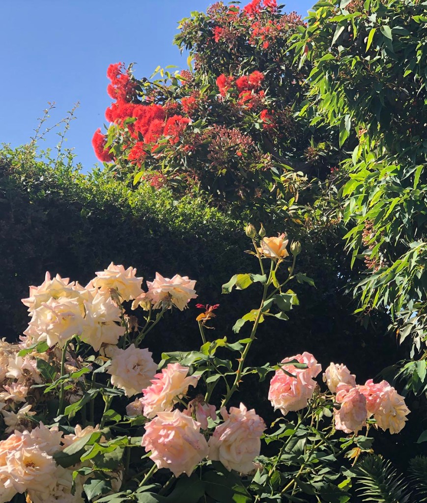 8 February: from late January into the first couple of weeks of February the red flowering gum is in full bloom. This tree is quite old: more than 70 probably. It makes a nice clash of reds with the Chinoiserie fabrique.