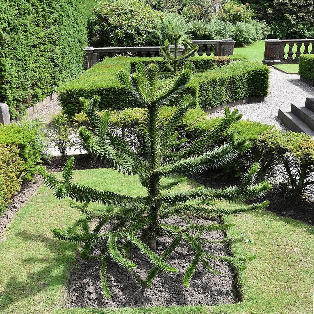 Another old tree is the monkey puzzle (Araucaria araucana) visible at the other end of the path leading to Pan. This is probably female, as monkey puzzles ‘are usually dioceious, with the male and female cones on separate trees’ but ‘occasional individuals bear cones of both sexes’, which may be the case here. A monkey puzzle expect who once visited suggested this. Either way, it produces nuts that grow into seedlings. The smaller monkey puzzles in the Wombat Hill Botanical Gardens (for example, at the right of the road near where it forks to go to Wombat Hill House cafĂ©) were planted from seeds from this tree in 1983. They are very slow growing. Also seedlings from this tree are two in the parterre Ă l’Angloise. The idea of planting a monkey puzzle in a small parterre comes from Biddulph Grange in Staffordshire, England, where some of the earliest monkey puzzles propagated in England were planted in the 1840s. When they got too big they were transferred to the arboretum. We will cross that bridge when we come to it!
