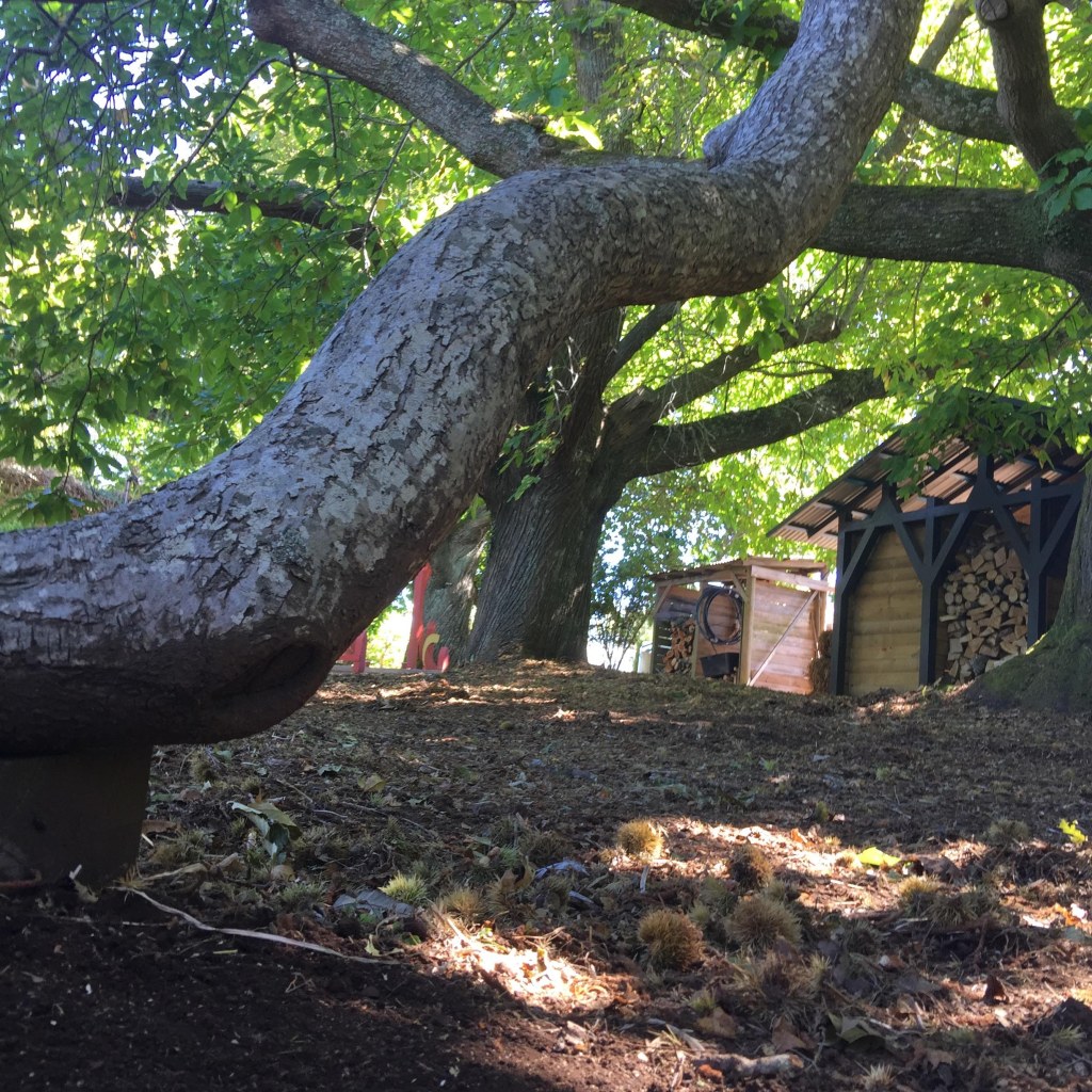 The big sweet chestnuts (castagna sativa) are on the Significant Tree Register. They are hard to date but were probably planted in the 1890s, but possibly earlier. TBecause European trees, like chestnuts grow very quickly here, they become brittle and tend to snap in storms. This is why they are propped. They bear heavy crops of nuts, but since the cockatoos arrived in the mid-1980s very few escape their depredations. You are welcome to use any you can find. The traditional way is to cut a cross in the bottom and roast them in the hot coals of a fire, or, failing that, on a hot plate, and serve them with salt a butter. The main cooking use is as chestnut flour, and dishes like Montebianco/Mont Blanc, a dessert made with chestnuts, whipped cream and chocolate. They are very labour intensive to prepare.